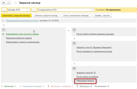 Реформация баланса в 1С Бухгалтерия 8 ред. 3.0 производится автоматически отдельной регламентной операцией при закрытии месяца. Реформация представляет собой завершающий этап при закрытии декабря. Ее выполнение невозможно, если существует хотя бы одна незавершенная операция. Для завершения месяца необходимо просто нажать соответствующую кнопку.
