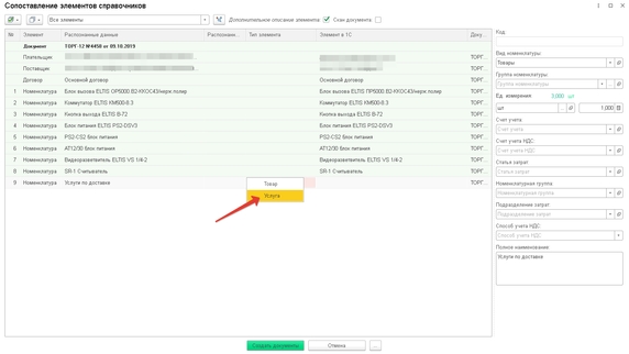 Если требуется создать новую номенклатуру как Услугу, необходимо изменить Тип элемента на строке, двойным щелчком мыши.