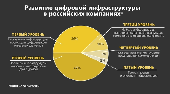При этом значительная доля организаций ещё не преодолела первый рубеж. Согласно данными консалтингового агентства «Команда-А», 36% компаний всё ещё находятся на начальной ступени дигитализации, где в «цифру» переведена лишь часть процессов. Так, например, если на ЭДО многие уже перешли, то управление процессами, учёт и планирование рабочего времени, проектный учёт автоматизированы далеко не у всех.