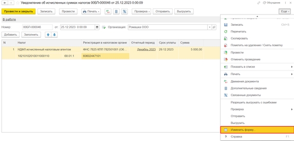 Если же релиз 3.0.146.24, то необходимо будет вручную поменять срок уплаты налога. Для этого в сам документ уведомления нужно добавить следующую колонку. Необходимо в верхнем правом углу нажать «Еще» - «Изменить форму», далее проставить отметку напротив строки «Срок уплаты», нажать «ОК».