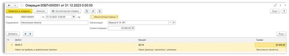 Однако для начисления патента в Бухгалтерии предприятия нет какой-то регламентной операции или документа. Это необходимо делать операцией, введенной вручную (раздел «Операции» - подраздел «Бухгалтерский учет» - «Операции, введенные вручную»). В ней необходимо отразить корреспонденцию по счетам учета и нужную для оплаты сумму, обычно какую-то часть.
