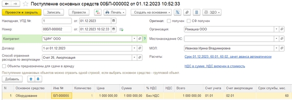 1. Отразить приобретение основного средств документом «Поступление основных средств» или «Поступлением оборудования» и «Принятием ОС к учету».