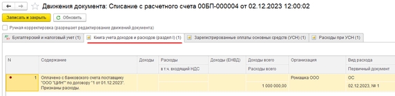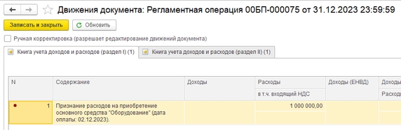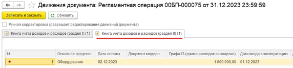 В движениях, которые она формирует можно увидеть записи Книги учета доходов и расходов, а именно сразу 2 разделов – первого со всем списком расходов, где они отразятся уже как принимаемые к учету и второго с отражением расходов именно по основным средствам.