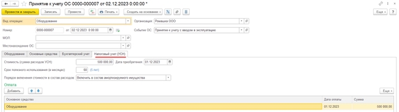 Если используется второй способ отражения поступления основных средств, то после документа «Поступление оборудования» в документе «Принятие ОС к учету» помимо остальной информации по объекту основных средств на вкладке «Налоговый учет (УСН)» заполняется сумма расходов по УСН, дата приобретения, порядок включения стоимости в состав расходов (выбирается «Включить в состав амортизируемого имущества»), в табличной части заполняется информация по оплатам с датами и суммами. Движения по регистрам УСН в нем аналогичны предыдущему способу.