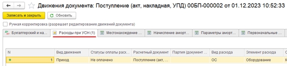 В движениях по документу важным является регистр «Расходы по УСН», в котором отражается приход: