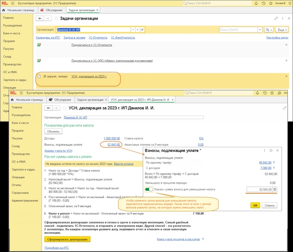 Как это работает:ИП с доходом 1 млн рублей в 2023 году имеет взносы в размере 1% - 7 000 рублей. В программе автоматически учитывается сумма 52 842 рубля (45 842 рубля фиксированных взносов + 7 000 рублей) для уменьшения налога за 2023 год.