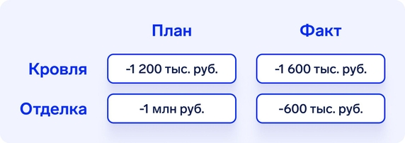 7. Укладка кровли обошлась вместо плановых 1 млн 200 тыс. руб. в 1 млн 600 тыс. руб. Затраты на отделку пришлось сократить на 400 тыс. руб.