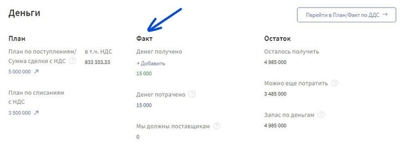 4. Заказчик перевёл аванс за проектирование — 15 тыс. руб. Деньги тут же появились в системе в отчётности по операциям. Пётр привязал их к отчёту План/Факт ДДС по этому заказу, чтобы данные не потерялись. Но аванс — это ещё не прибыль, потому что работа пока не закончена. Прибылью он станет после подписания акта.