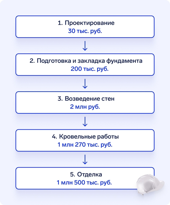 Пётр заключил договор на строительство. Стоимость контракта — 5 млн руб. Срок сдачи — 30 октября 2023 года. Договорились, что заказчик будет переводить авансы перед каждым этапом.