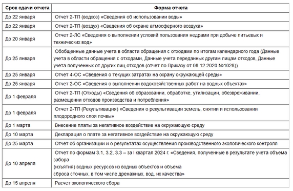 В таблице представлены формы отчетов по экологии, которые необходимо подготовить в ближайшее время: