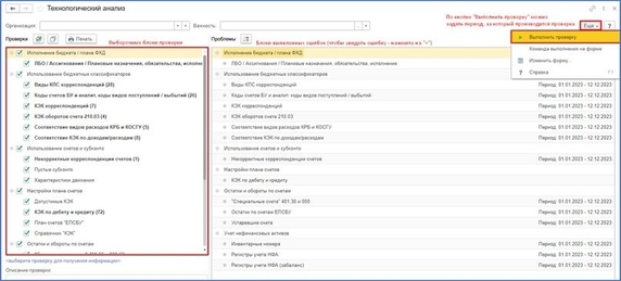 Для начала технологического анализа нужно нажать на кнопку Еще – Запустить проверку, откроется окно с выбором периода проведения проверки, после чего сформируется отчет об ошибках.