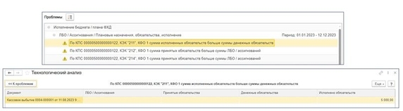 С помощью технологического анализа можно увидеть правильность введенных данных по счетам (например, соответствуют ли введенные бюджетные обязательства денежным обязательствам), корректность отражения данных по регистрам, соответствие КЭК счетам бух.учета и многое другое. При этом в каждую ошибку можно перейти, легко найти конкретные документы, в которых эта ошибка допущена.