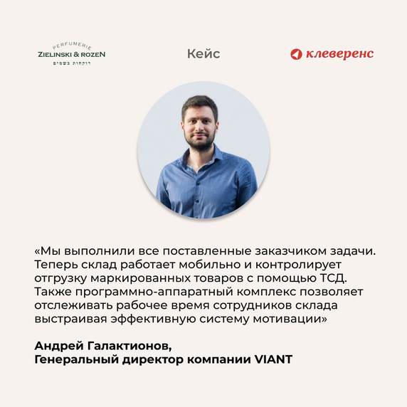 Основной задачей, которую ставил перед нами парфюмерный дом Zielinski & Rozen, было автоматизировать все складские процессы и обеспечить бесперебойную работу терминалов сбора данных на складе компании.Андрей Галактионов, Генеральный директор компании VIANT