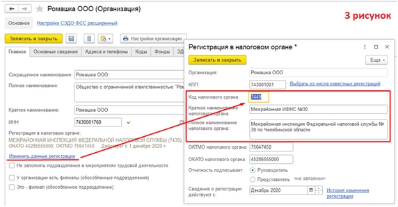Укажите новый код ИФНС и новое наименование налогового органа вместо прежнего. Другие реквизиты не меняются см. рис. 3
