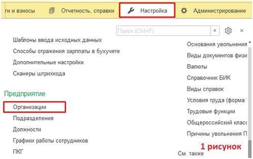 Для этого в карточке организации (меню Настройка – Предприятие – Организации или Реквизиты организации) см. рис. 1