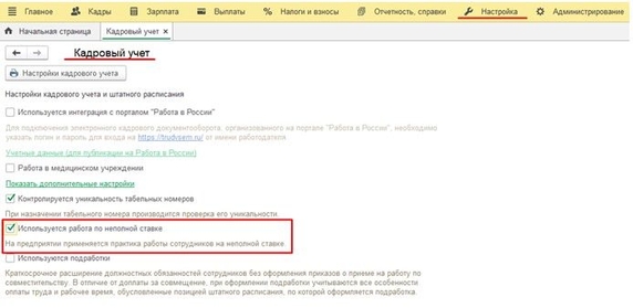 В программе необходимо указать количество ставок и настроить график неполного рабочего времени.Для этого в настройках кадрового учета активируется опция "Используется работа по неполной ставке".Создается график работы с указанием неполного рабочего времени и длительности рабочей недели.При кадровом перемещении указывается новый график работы и соответствующее количество ставок.