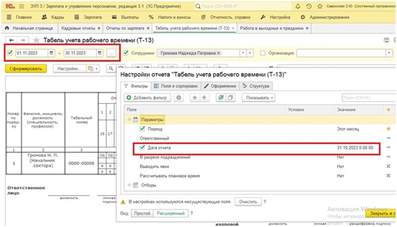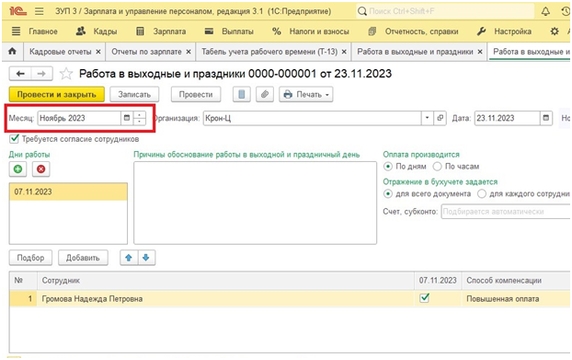 Проверьте в настройках отчета "Дата отчета".Если дата относится к месяцу, ранее чем указан месяц в документе "Работа в выходные и праздники", то работа в выходные не будет отражена в табеле.