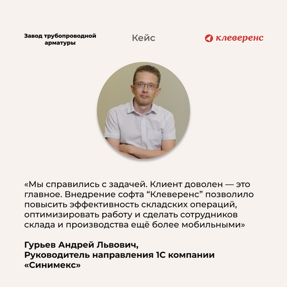 Софт удобен в плане интеграции с 1С: можно быстро настроить интеграцию с новой учётной системой. А вот воплотить в жизнь требования заказчика, которые не соответствуют стандартному процессу, реализованному в «Складе 15», — уже сложнее. Но мы справились и с этой задачей. Клиент доволен — это главное. Внедрение софта «Клеверенс» позволило повысить эффективность складских операций, оптимизировать работу и сделать сотрудников склада и производства ещё более мобильными.Гурьев Андрей Львович, Руководитель направления 1С компании «Синимекс»