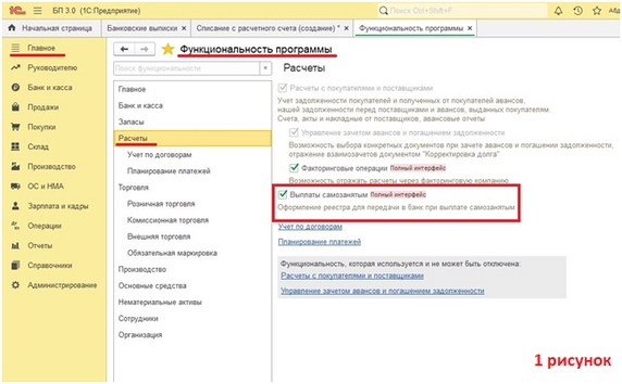 Для того, чтобы включить возможность работы с самозанятыми в программе 1С: Бухгалтерия 8 нужно зайти в раздел: Главное – Функциональность и на закладке Расчеты установить флажок Выплаты самозанятым. (см рис.1)