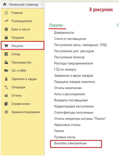 Оказание услуг самозанятыми лицами отражаются документом Выплаты самозанятым (Раздел: Покупки – Выплаты самозанятым) (см. рис.3)