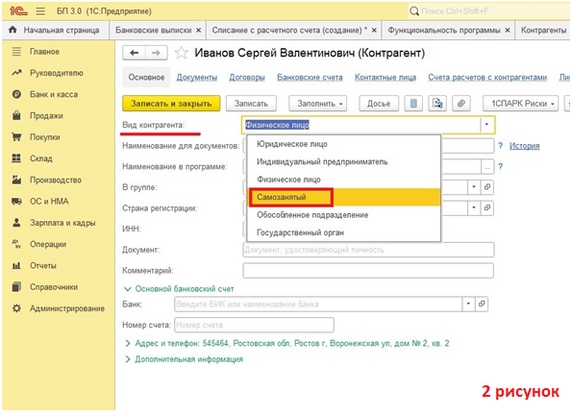 В справочнике Контрагенты появится возможность в поле Вид контрагента выбрать вид Самозанятый. (см. рис.2)