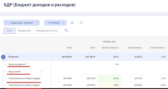 Следить за выполнением плана по доходам помогает такой инструмент, как Бюджет доходов и расходов (БДР). В нём фиксируется, сколько денег предприятие должно получить — это план, и сколько удалось заработать — это факт. Подробнее про задачи этого вида бюджета и формирование можно почитать здесь.