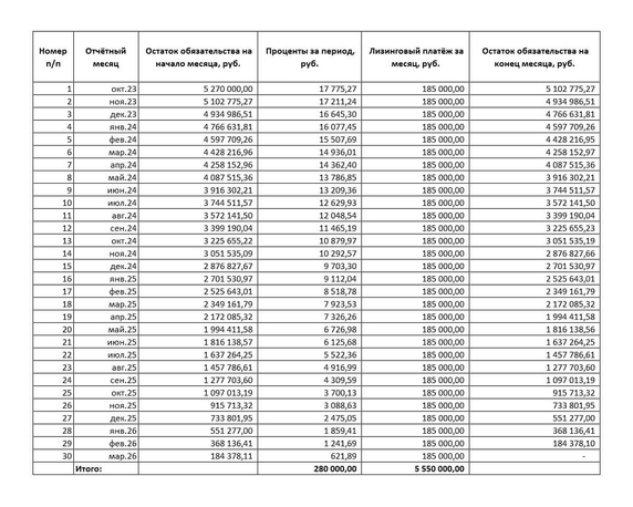 Срок лизинга до марта 2026 года, согласно графику лизинговых платежей последний лизинговый платеж (за март 2026 года) признается выкупной стоимостью. После уплаты выкупной цены право собственности на авто переходит к лизингополучателю. Сумма лизинговых платежей по графику 6 660 000 руб. в т. ч. НДС 20%, уплачиваются с октября 2023 по март 2026 ежемесячно равными частями (222 000 руб. х 30 платежей). Дополнительных расходов по доведению ОС до готовности нет. СПИ автомобиля — 37 месяцев. Сумма, уплаченная за предмет лизинга лизингодателем 5 270 000 руб. (без НДС).