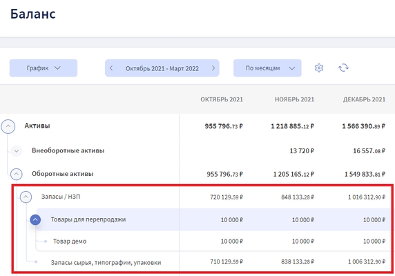 Динамику изменения количества запасов легко отследить в Балансе. Их учёт входит в статью оборотных активов компании.