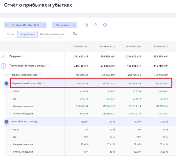 Маржинальную прибыль наблюдают в динамике в ОПиУ. В сервисе «Финтабло» её можно отследить в разрезе направлений деятельности компании или площадок реализации. В отчёте видно, какое направление повлияло на итоговый результат.