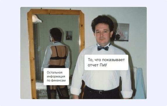 Или обратная сторона. Вы ведете ПиУ и видите, как круто отработала компания в этом квартале, 一 чистая прибыль увеличилась на 35%. И вы решили выдать премию руководящему составу. Но вот пришло время платить за аренду, а средств на это нет. И тут встает вопрос, что же могло случиться, ведь ПиУ показал, что деньги у компании есть. Все просто 一 деньги в ПиУ считаются методом начисления. Они признаются в отчете после оказания услуги или отгрузки товара, а не в момент начисления на счет. И если бы вы обратились к ДДС, то могли заметить, что на счетах денег нет. Причины могут быть разными, например, заморозка средств в дебиторке. Но суть остается одна 一 для принятия решений нужно использовать несколько инструментов и анализировать ситуацию с разных сторон.