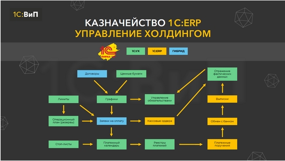 Если урезанной функциональности в части казначейства заказчику недостаточно, но при этом нужно сохранить возможности управления ресурсами, фирма «1С» предлагает гибрид — «1С:ERP Управление холдингом». Эта конфигурация объединяет процессы из «1С:ERP Управление предприятием» и «1С:Управление холдингом». Синтез этих возможностей на примере казначейства представлен на схемах ниже.