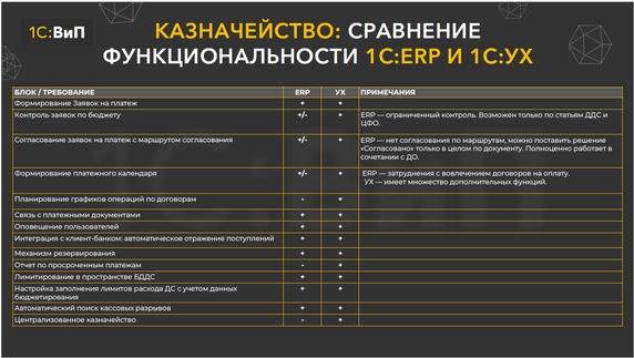 Для наглядности сравним ключевые моменты в «1С:ERP Управление предприятием» и «1С:Управление холдингом» — конфигурации с одной из самых мощных функциональностей в части казначейства.