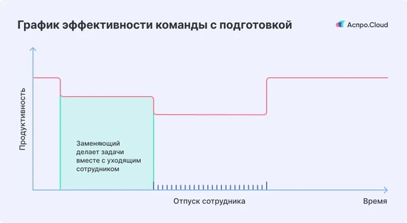 Да, конечно, это скажется на продуктивности команды, поскольку будет выполняться двойная работа. Заменяющий сотрудник делает меньше своей работы, а новую пока делает не так эффективно. Да и в целом обучение — это всегда минус к продуктивности. Такую просадку по продуктивности можно изобразить в виде графика. Очень примерного графика.