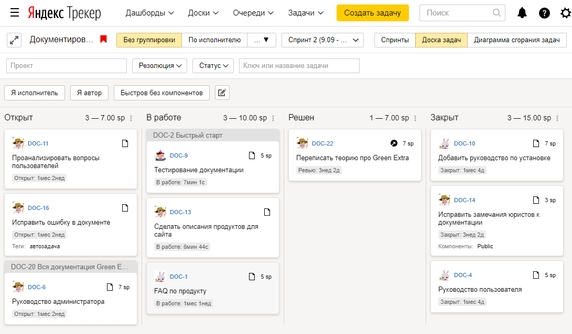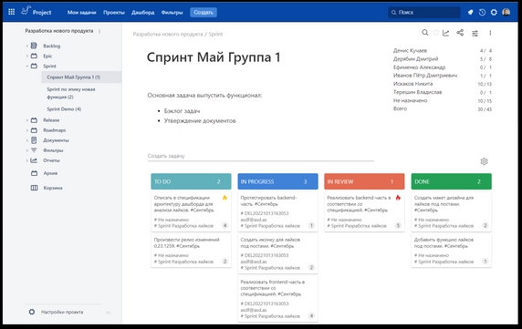 - аналитика спринтов для оценки продуктивности команды;