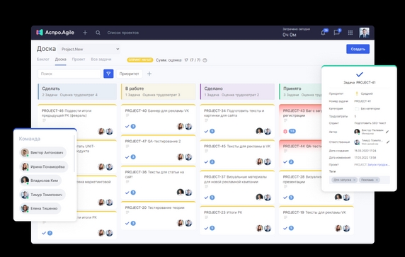 - Канбан- и Scrum-доски для организации задач, планирования спринтов и распределения обязанностей;