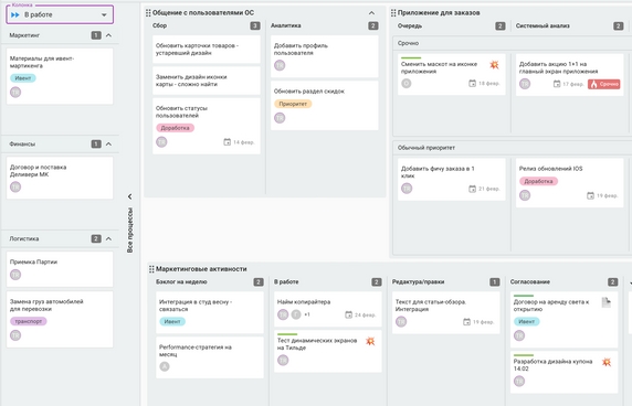 - Канбан-доски без ограничений по количеству колонок, дорожек и задач;