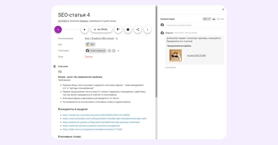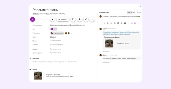 Это создает прозрачность и доверие. Клиенты смогут оставлять комментарии, вносить правки и отслеживать статус задач, что избавит вас от лишних писем, звонков и перепрыгивания из чата в чат.