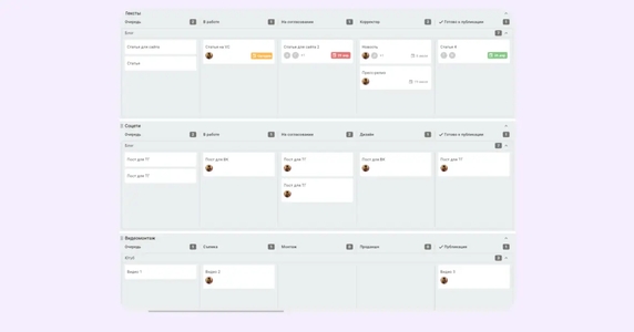 SMM-специалисты, видео- и фотографы, копирайтеры, дизайнеры и другие контент-специалисты часто работают сразу над несколькими проектами: статьи, посты в соцсетях, рекламные кампании и многое другое. В Kaiten можно сделать отдельные доски для каждого проекта и легко управлять задачами.