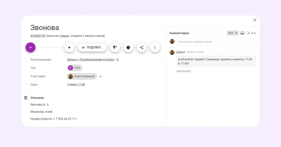 В работе с командой, важно, чтобы все участники были в курсе предстоящей работы. Например, администратор салона красоты может пригласить в Kaiten своих коллег-мастеров. Также можно настроить пуш-сообщения, которые будут приходить при добавлении мастера в карточку с записью. Так сотрудник получит уведомление о предстоящей записи и сможет спланировать свою работу.