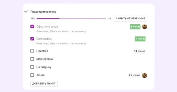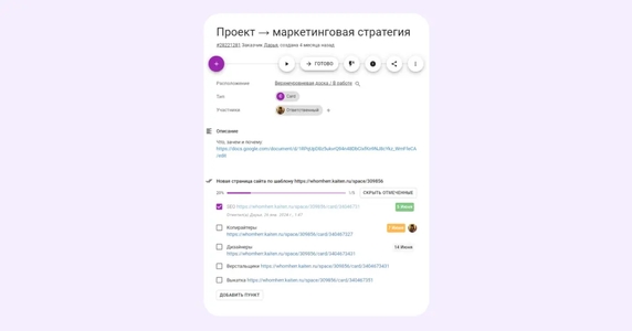 При необходимости также можно сделать чек-лист, а в каждый пункт добавить ссылки на подзадачи с пространств коллег. Так руководитель сможет отслеживать актуальный статус хода проекта.