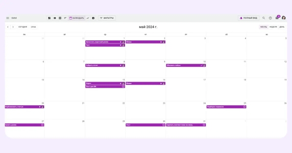 Представьте себе: вы планируете контент для блога, социальных сетей и email-рассылок — каждая задача четко прописана и имеет свой дедлайн. Такой подход помогает не упускать важные детали, распределять задачи по приоритетам и следить за их выполнением. Вы можете устанавливать дедлайны, назначать задачи себе и коллегам и отслеживать прогресс.