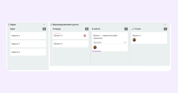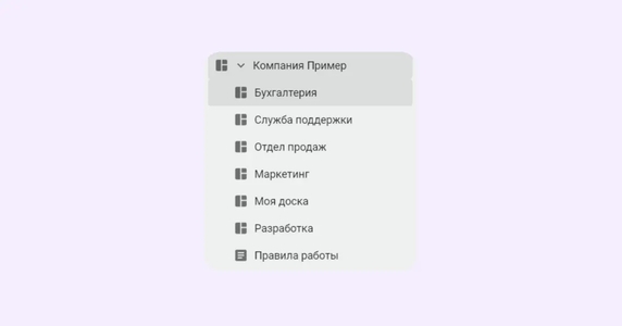 Например, чтобы визуализировать процессы разных отделов компании, можно для каждого из них сделать отдельное пространство, а на нем — доски, которые будут отображать разные задачи или задачи отдельных сотрудников.