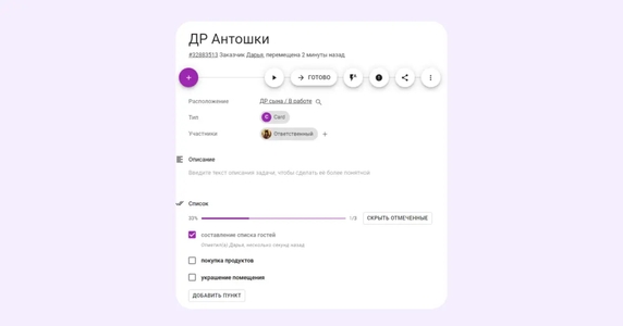 Также администраторы могут разбивать рабочие процессы на отдельные задачи и подзадачи с помощью чек-листов. Представьте себе: вы планируете смены сотрудников, заказы продукции и маркетинговые акции — каждая задача четко прописана и имеет свой дедлайн и ответственного. Всё это можно указать прямо в списке.