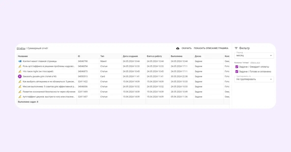 Также контент-специалисты часто работают с аналитикой и отчетами. Kaiten позволяет отслеживать выполнение задач и оценивать их эффективность. Вы можете легко видеть, какие задачи выполнены, какие — в процессе, а какие — требуют внимания.