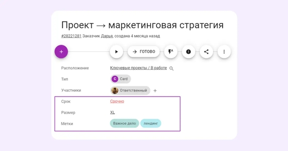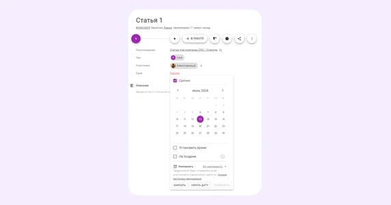 Каждую задачу можно оформить в виде карточки. Внутри можно подробно описать задачу, указать срок выполнения, прописать ответственных сотрудников, приложить файлы и добавить ссылку с карточкой с пространства подчиненных.