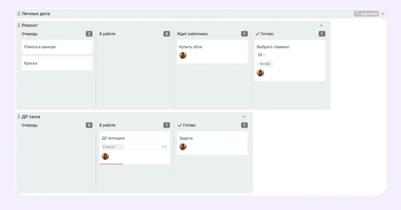 Для личных целей можно создать несколько досок, например, «Домашние дела», «Ремонт» и т.д.