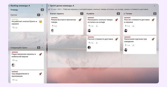 - На Scrum-доске одновременно отображается бэклог всего проекта и бэклог текущего или планируемого спринта;