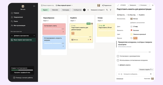 Strive — еще один таск-трекер, у которого в центре внимания канбан-метод. Система появилась пару лет назад, поэтому пока отстает от более крупных игроков, но уже сейчас позволяет организовать работу команды без необходимости использовать дополнительные решения. Для этого можно создавать пространства под разные проекты, подробно заполнять карточки и обсуждать внутри них задачу, распределять роли между сотрудниками и создать базу знаний. Следить за процессами можно с помощью канбан-досок, диаграммы Ганта, списка задач или календаря.