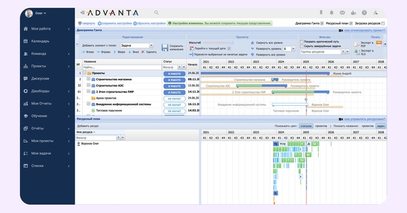 ADVANTA — как внешне, так и по возможностям больше напоминает корпоративный портал. Команда системы позиционирует ее как готовую ERP-платформу, которая комплексно охватывает все аспекты работы над проектом, автоматизирует процессы, помогает планировать и отслеживать использование ресурсов. Визуализировать процессы можно с помощью диаграммы Ганта и календаря.