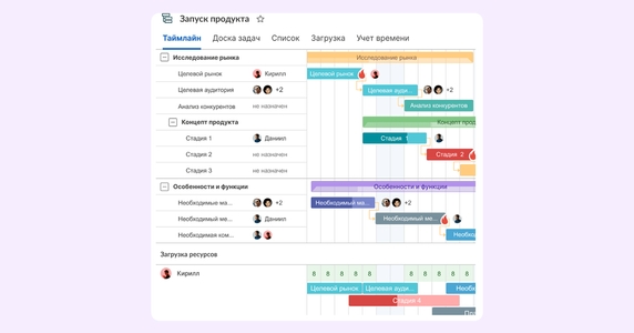 - диаграмма Ганта, ресурсное планирование и инструменты для работы с портфелем проектов;